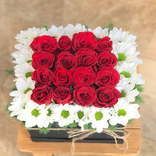 Kare kutu içerisinde 16 Adet Kırmızı Gül ve Papatya